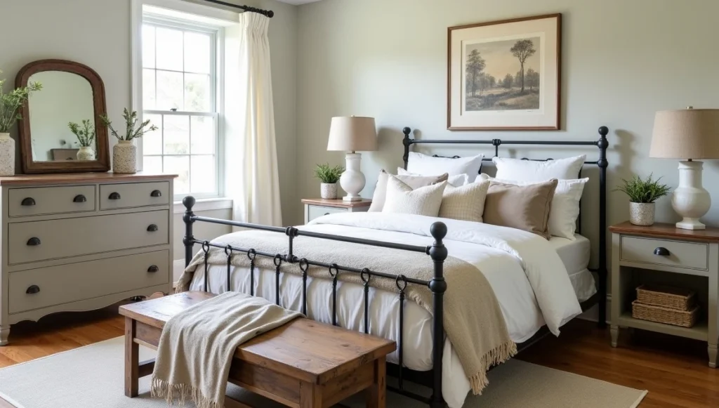 Farmhouse bedrooms should be calm and simple. The bed frame sets the tone – wrought iron, painted wood, or reclaimed timber all work. Just make sure it has some presence without overwhelming the room.