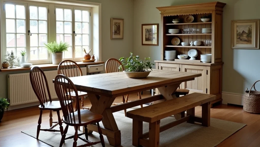 For seating, mix it up. A bench on one side, chairs around the rest. Windsor chairs are classic, or simple ladder-backs. They don’t all have to match perfectly – that’s not how real farmhouses evolved.