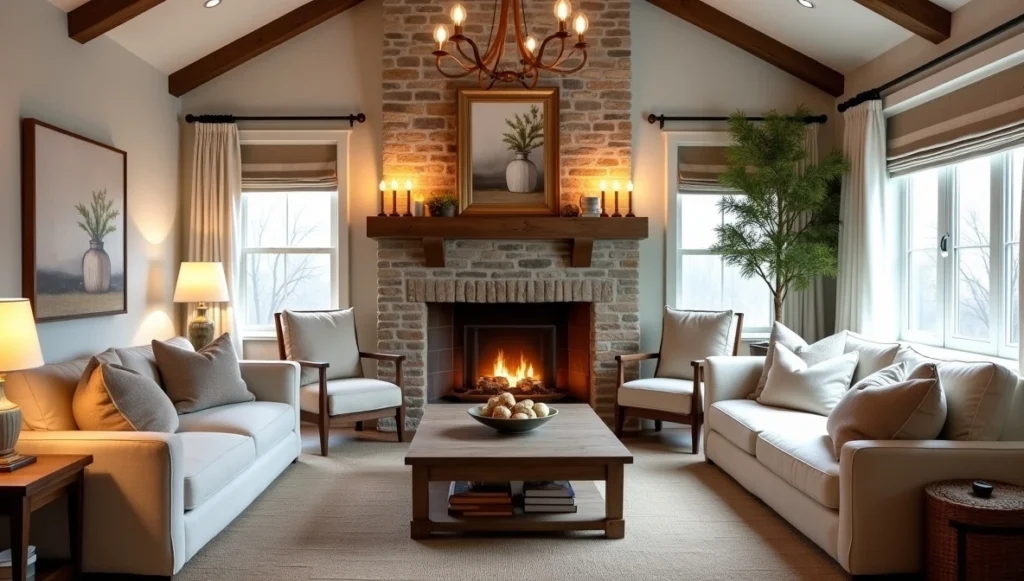 Farmhouse living rooms are about comfort first, style second. I start with seating that you’d actually want to sink into after a long day – deep sectionals in linen or sturdy cotton, chairs that don’t make you sit up straight like you’re at a job interview.