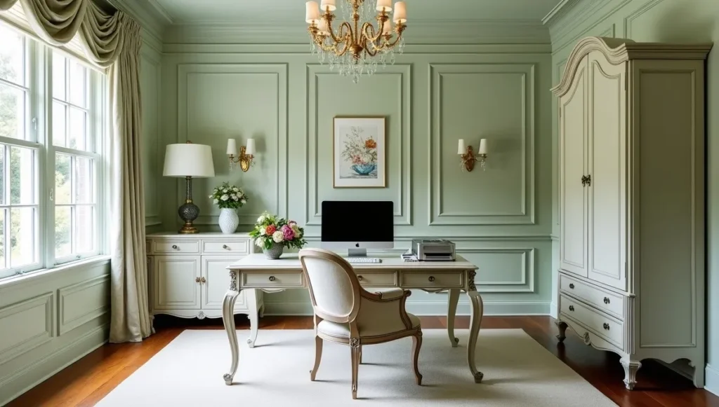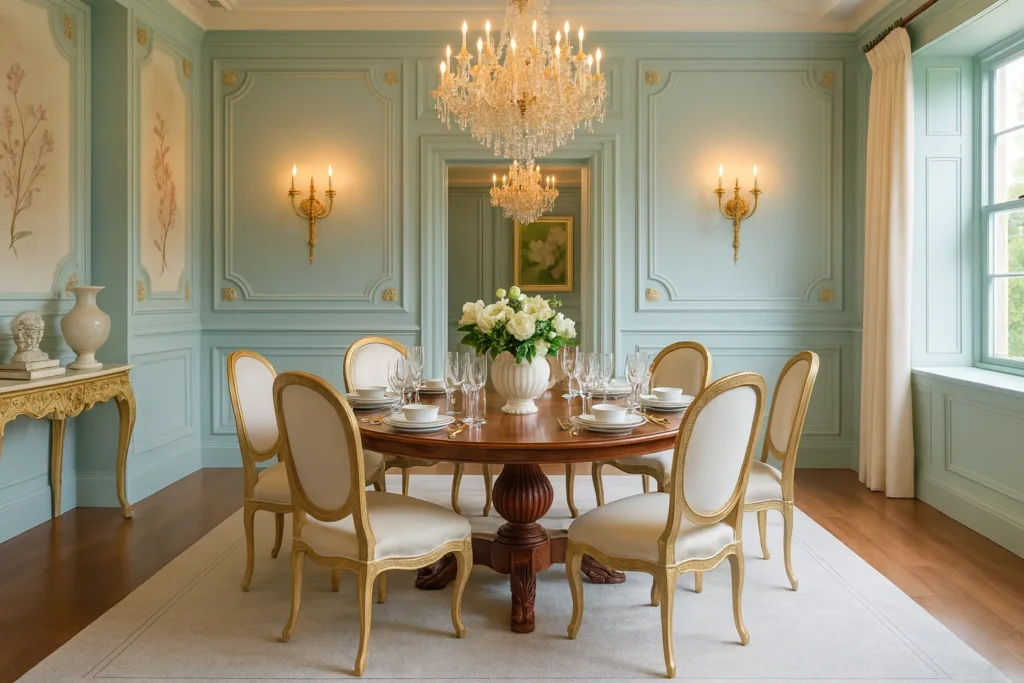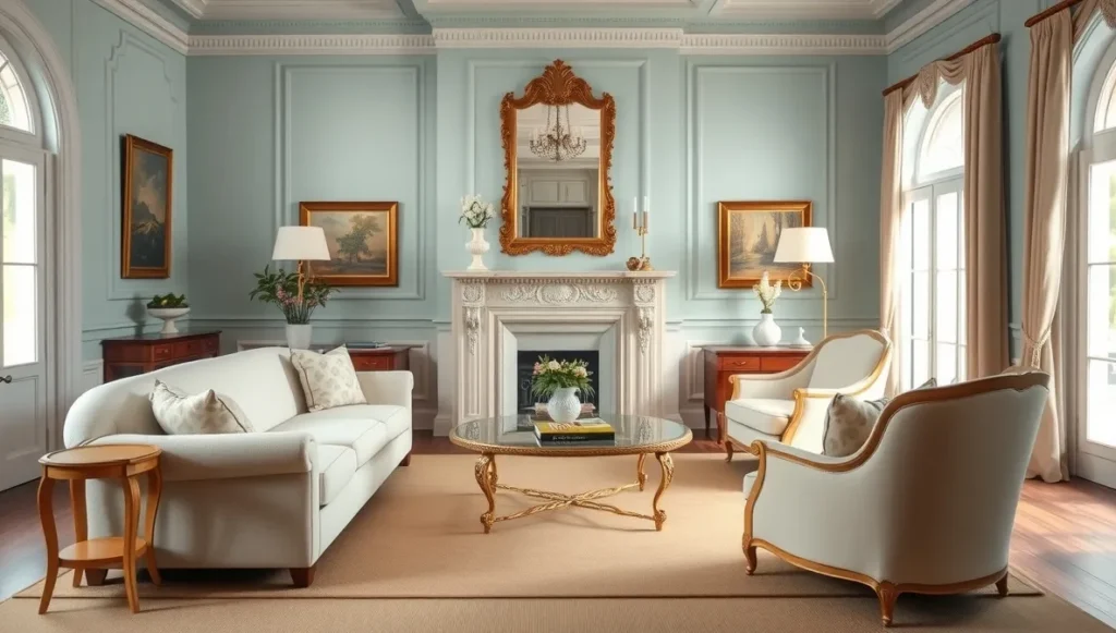 Color-wise, I usually pick one soft color for the walls – let’s say that perfect powder blue – then layer in cream and gold through furniture and accessories. The trick is making everything feel intentional but effortless.