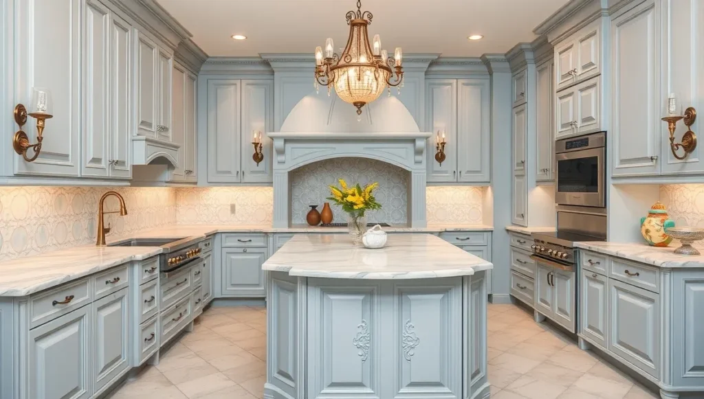 Rococo kitchens need serious planning, but they’re possible. Custom cabinetry with soft curves and raised panels, painted in cream or pale blue. Bronze hardware that looks like it belongs in a château. Marble countertops with subtle veining.