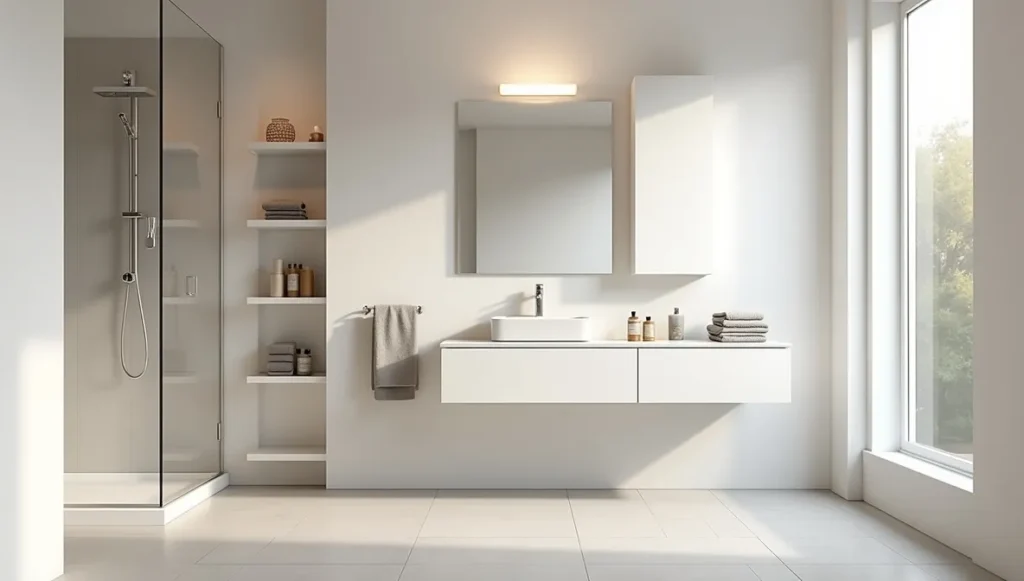 Wall-mounted vanities make tiny bathrooms look way bigger and there’s no weird corner where dust bunnies go to die. Medicine cabinets should be recessed, not stuck on the wall like an afterthought. Built-in shower niches beat those hanging shower caddies every single time. Towels – two colors max please. More than that and you’re running a gym, not a home.