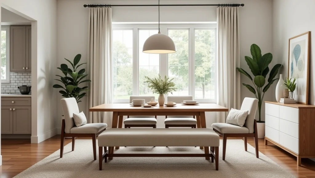 Extension tables that look good both expanded and contracted are gold. Leaves stored in the table itself save space and look way cleaner. Mix your seating instead of matching everything. Bench on one side adds interest and usually seats more people than individual chairs.