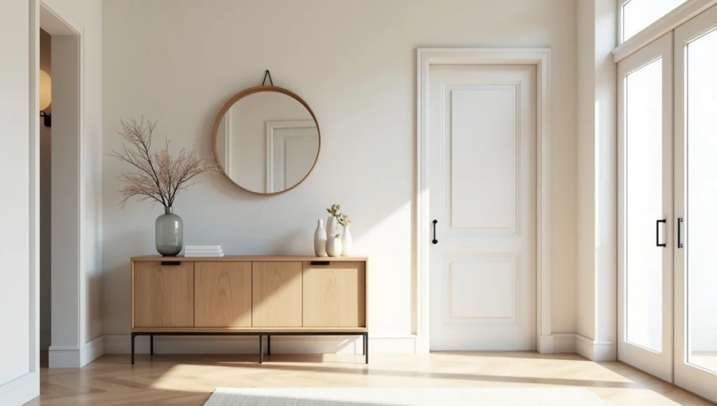 All the stuff that doesn’t make the minimalist cut still needs to live somewhere – cleaning supplies, holiday decorations, extra bedding. Built-ins are worth it if you’re staying put. If you’re renting, look for furniture that hides storage without being obvious about it.