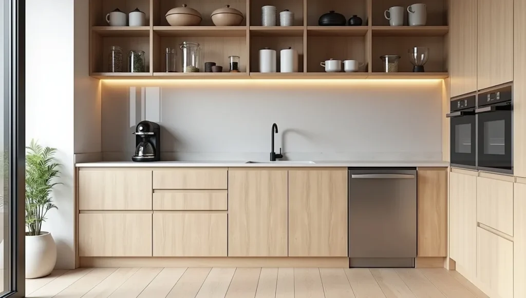 Counter space is everything. If you don’t use it daily, it shouldn’t live on your counter. I build these “appliance garages” – cabinets with doors that roll up to hide blenders and coffee makers and stuff. Keeps counters clear but everything’s still right there when you need it. Open shelving looks great in photos but only works if you’re super disciplined about what goes up there. Random mismatched containers will destroy the whole vibe, so try and keep matching ones in them.