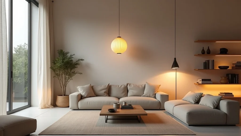 Then layer your artificial light. One ceiling fixture = harsh shadows and prison vibes. Add table lamps, floor lamps, maybe some LED strips hidden under floating shelves for that subtle glow. Currently obsessed with this Japanese-style pendant I found that looks like art during the day and gives the most amazing warm light at night.