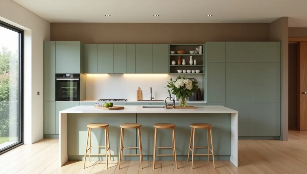 White kitchens everywhere. I’m so over it. White’s fine but it’s not the only option, people. Some colors I’m loving right now: this sage green that’s almost gray, warm mushroom tones, even deep navy when you want drama without chaos. The key is picking maybe 3 colors total and sticking with them throughout your space. That’s the kitchen I’ve recently delivered to my client.